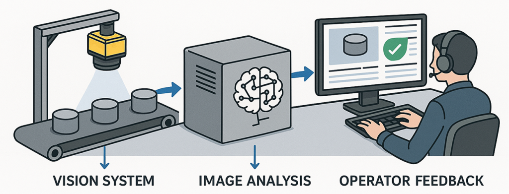 Our solution is an intelligent quality control system for products, which can be integrated with existing production lines or used as a stand-alone solution. The system relies on image analysis using neural networks and AI. It consists of an industrial vision system, a unit responsible for image analysis, and a workstation for operators providing feedback. The solution delivers detailed information about the analyzed product, employing various neural network architectures. Thanks to AI and the ability to learn from feedback, the system continuously adapts to a changing environment.